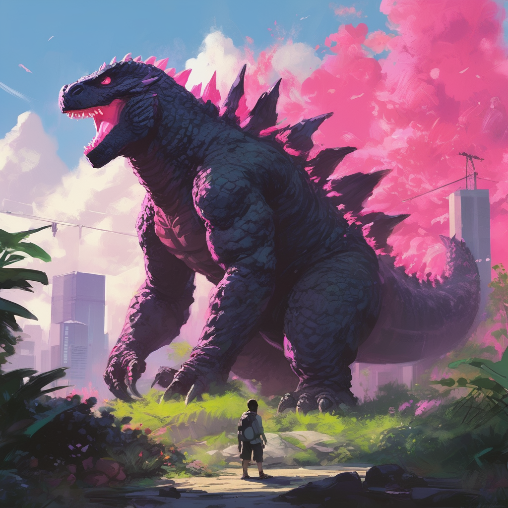 Godzilla roared loudly, ready to take on the villains. His pink dorsoplates shimmered in the sunlight as he prepared for battle.